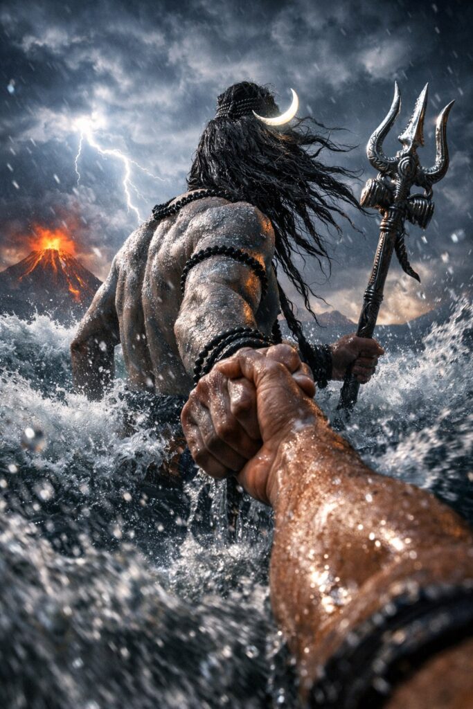 True First Person POV, hyper-real cinematic mythological scene.Camera perspective from viewer’s eyes — viewer’s wet arm visible in foreground, being tightly held by Lord Shiva’s powerful hand as he pulls the viewer forward through a violent ocean storm.Lord Shiva shown from slightly back-side angle, muscular divine body, ash-covered skin texture, long flowing wet hair blowing in extreme wind, crescent moon glowing in his hair. He holds a detailed trident (Trishul) in his other hand, metal reflecting lightning flashes.Massive stormy ocean waves crashing around waist level, water splashing toward camera lens, droplets frozen mid-air, realistic water physics. Dark thunder clouds in sky with bright lightning bolts illuminating the scene dramatically. In background, a volcanic mountain erupting with lava glow mixing with storm light.Ultra photorealistic skin texture, visible pores, realistic wet skin shine, natural muscle definition.Cinematic orange and blue color grading.Extreme depth of field.Motion blur in water splashes.Dynamic lighting from lightning strikes.8K resolution, ultra-detailed, HDR, sharp focus, high contrast, dramatic shadows.No cartoon look, no CGI plastic skin, real human photorealism.Epic mythological atmosphere, powerful emotional intensity, destiny-driven energy.