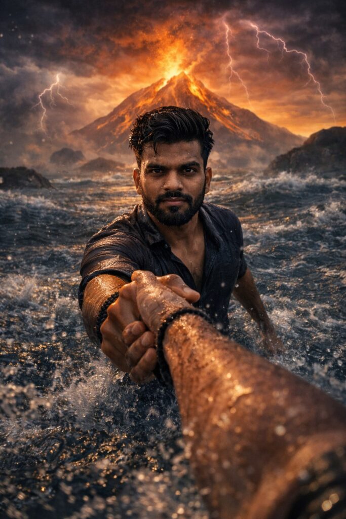 True First Person POV, ultra-real cinematic photograph.Camera perspective from viewer’s eyes — viewer ka wet arm foreground me visible, jisey ek strong aadmi tightly pakad kar samundar ke beech kheench raha hai.Scene: Violent ocean storm, waist-deep water, powerful waves crashing around. Water splashes camera lens par girte hue, droplets frozen mid-air, realistic water physics.Main subject:Indian man with short curly hair, thick beard, intense determined expression. Wet shirt clinging to body, realistic fabric texture soaked in water. Natural brown skin tone, visible pores, real human skin texture (no AI plastic look). Strong grip holding viewer’s hand tightly — emotional, destiny-driven energy.Background:Massive volcanic mountain erupting dramatically. Bright lava flowing from the peak. Orange fiery glow illuminating storm clouds. Lightning bolts striking across dark dramatic sky. Smoke and ash blending with storm atmosphere.Lighting:Cinematic orange (lava glow) + cool blue (storm ocean) color contrast.Dynamic lightning highlights on face and water surface.HDR lighting, dramatic shadows, rim light from volcano.Camera & Quality:Ultra photorealistic, 8K resolution, sharp focus on subject face and hands.Shallow depth of field.Foreground arm slightly motion blurred.High contrast, cinematic grading, epic atmosphere.Professional DSLR photography look, natural skin details.Mood:Powerful, survival energy, destiny moment, intense emotional pull.